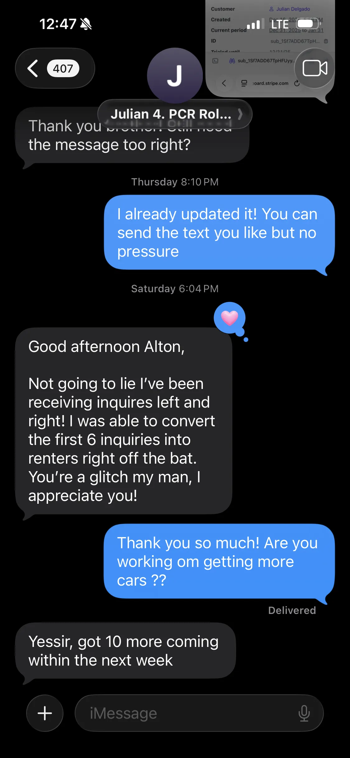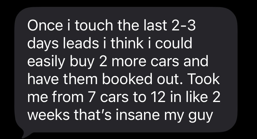 If you're trying to grow to 40, 60, or 80+ cars, you need consistent, predictable leads—not just whatever Marketplace gives you. I'll build you a premium lead system that fills your fleet with renters who pay higher rates.
